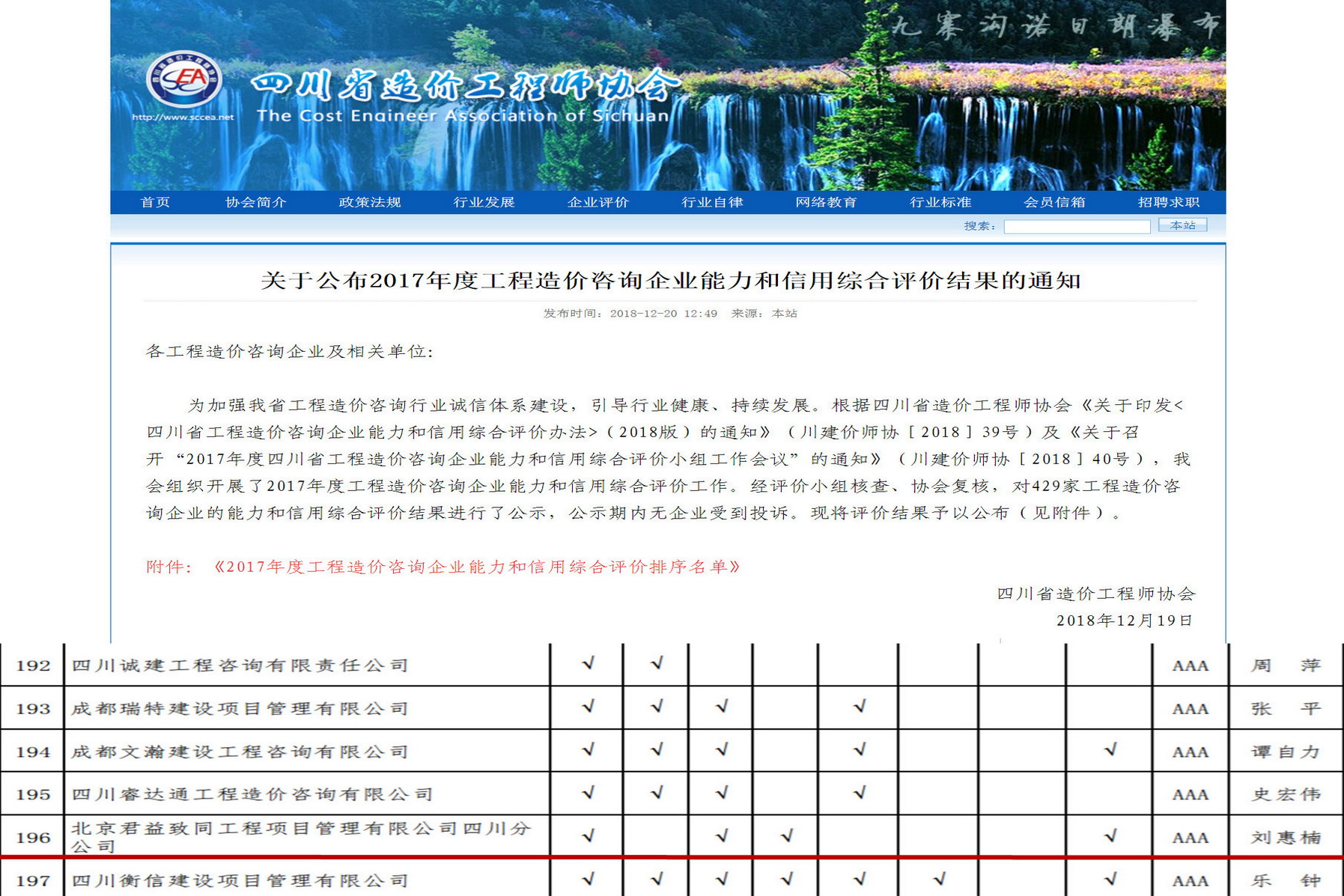 四川分公司获得四川省2017年度工程造价咨询企业能力和信用“AAA”综合评价
